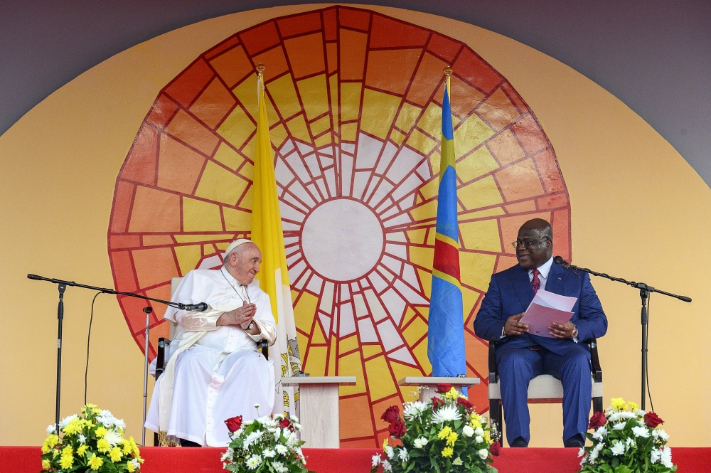 "As well as armed militias, foreign powers hungry for the minerals in our soil commit, with the direct and cowardly support of our neighbour Rwanda, cruel atrocities," Congolese President Felix Tshisekedi said, speaking just before the pope on the same stage on a hot, muggy afternoon.