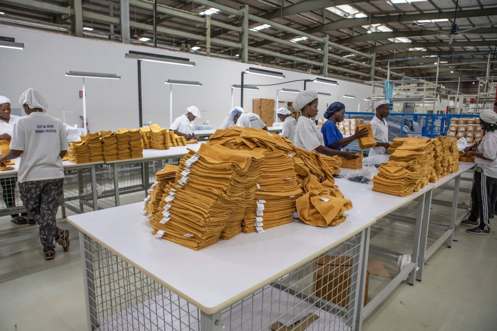 Workers fold towels in the textile factory in the Glo-Djigbe industrial zone (GDIZ) on January 15, 2025. (Photo by Yanick Folly / AFP)