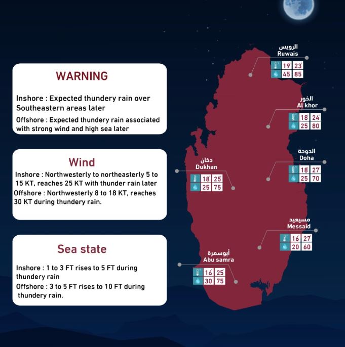 Doha: Weather inshore tonight until 6:00 am on Thursday will be partly cloudy to cloudy with scattered rain, maybe thundery over Southeastern areas later, the Department of Meteorology said in its daily weather report.