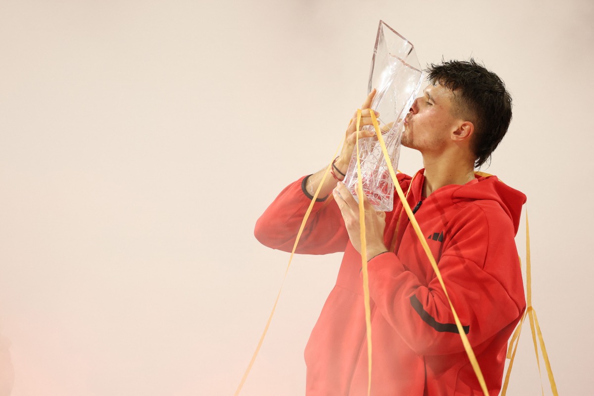 Jakub Mensik of the Czech Republic poses with the championship trophy after winning the Miami Open.