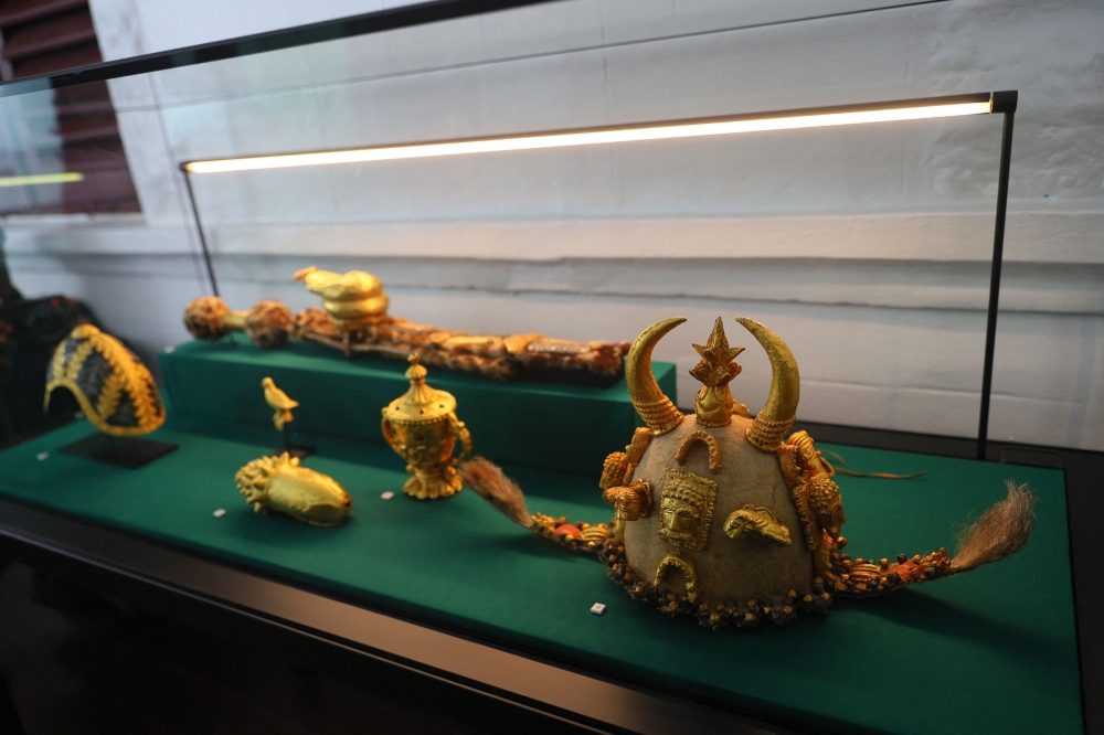 A general view of artefacts returned by the British Museum and the Victoria and Albert Museum (V&A) on a three-year loan at the Manhyia Palace Museum in Kumasi, Ghana, on May 1, 2024. (Photo by Nipah Dennis / AFP)