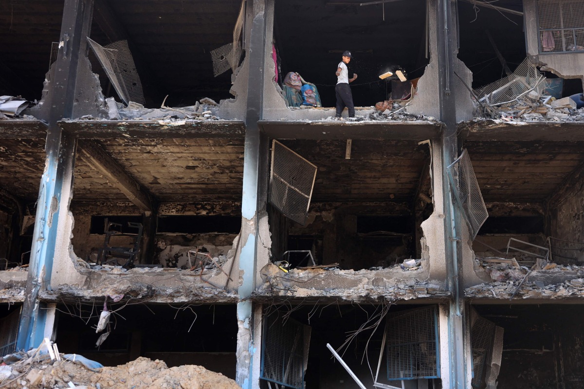 A Palestinians child salvages some belongings from a damaged UN-run school in the Jabalia refugee camp in the northern gaza Strip after he returned briefly with others who sought to check on their homes on May 31, 2024. (Photo by Omar AL-QATTAA / AFP)
