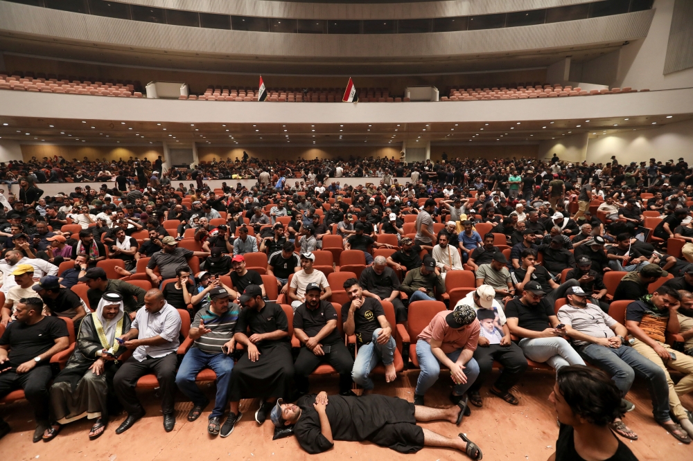 Supporters of Iraqi populist leader Moqtada al-Sadr gather during a sit-in at the parliament building in Baghdad, Iraq, August 1, 2022. (REUTERS/Wissam Al-Okaili)