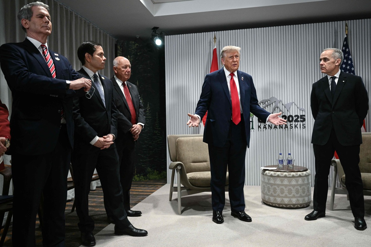 US President Donald Trump speaks as Canadian Prime Minister Mark Carney (R) looks on as they meet during the Group of Seven (G7) Summit at the Pomeroy Kananaskis Mountain Lodge in Kananaskis, Alberta, Canada on June 16, 2025. Photo by Brendan SMIALOWSKI / AFP