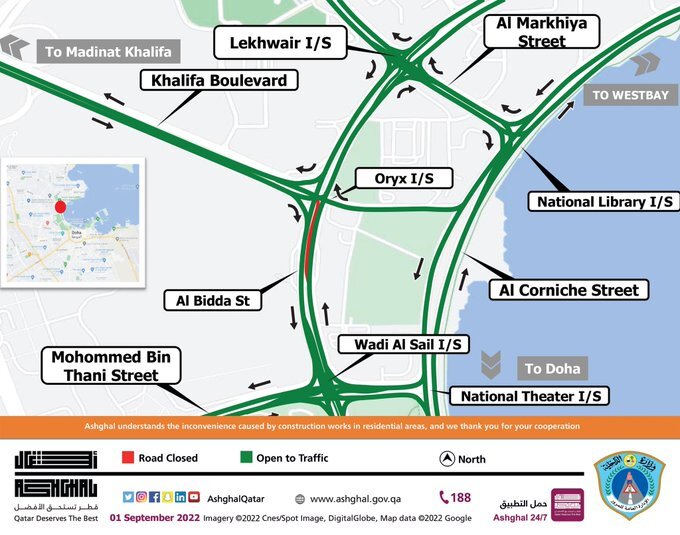 On Friday, September 2, 2022, the intersection of Qatari bin Al Fujaa Street with Ibn Mahmoud Street will be closed for a day. The closure effective from 1am to 9am is designated to complete the asphalt works. Commuters can use Al-Khaleej Street and Al-Jazeera Street to reach their destinations.