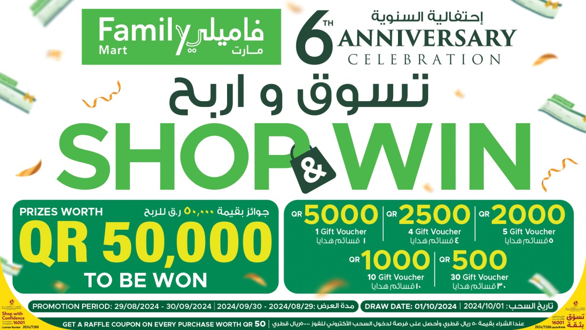 Doha, Qatar: As Family Mart celebrates its 6th anniversary, customers in Qatar are invited to participate in the exclusive ‘Shop and Win’ promotion. Shoppers have the chance to win QR 50,000 in shopping vouchers, making this a prime opportunity to enhance their grocery shopping experience in Qatar. The promotion, running until September 30, 2024, provides an e-raffle coupon for every QR 50 spent, with the grand draw scheduled for October 1, 2024, at 5 PM.