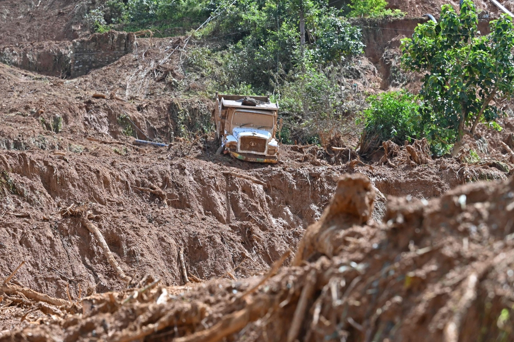 A damaged truck pictured in a landslide-affected village following heavy rains in Lalitpur district on October 1, 2024. (Photo by Prakash Mathema / AFP)