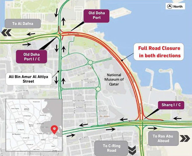 Doha, Qatar: The Public Works Authority, 'Ashghal', announces a full road closure in Al-Corniche Street for those coming from Old Doha Port Intersection heading toward Sharq Intersection, and vice versa.