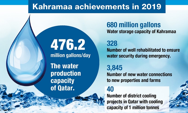 The production capacity of water in 2019 in Qatar reached 476.2 million gallons per day, and Kahramaa and Umm Al Houl Power signed an agreement to increase the desalination capacity by 61.5 million gallons per day, (equivalent to 280,000 cubic meters per day), according to an achievement report of Kahramaa issued at the end of 2019.