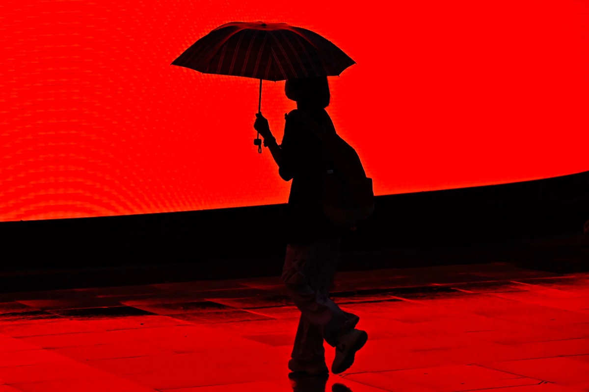 A woman holding an umbrella walks during a rainstorm in Beijing on July 30, 2024. Photo by Pedro PARDO / AFP