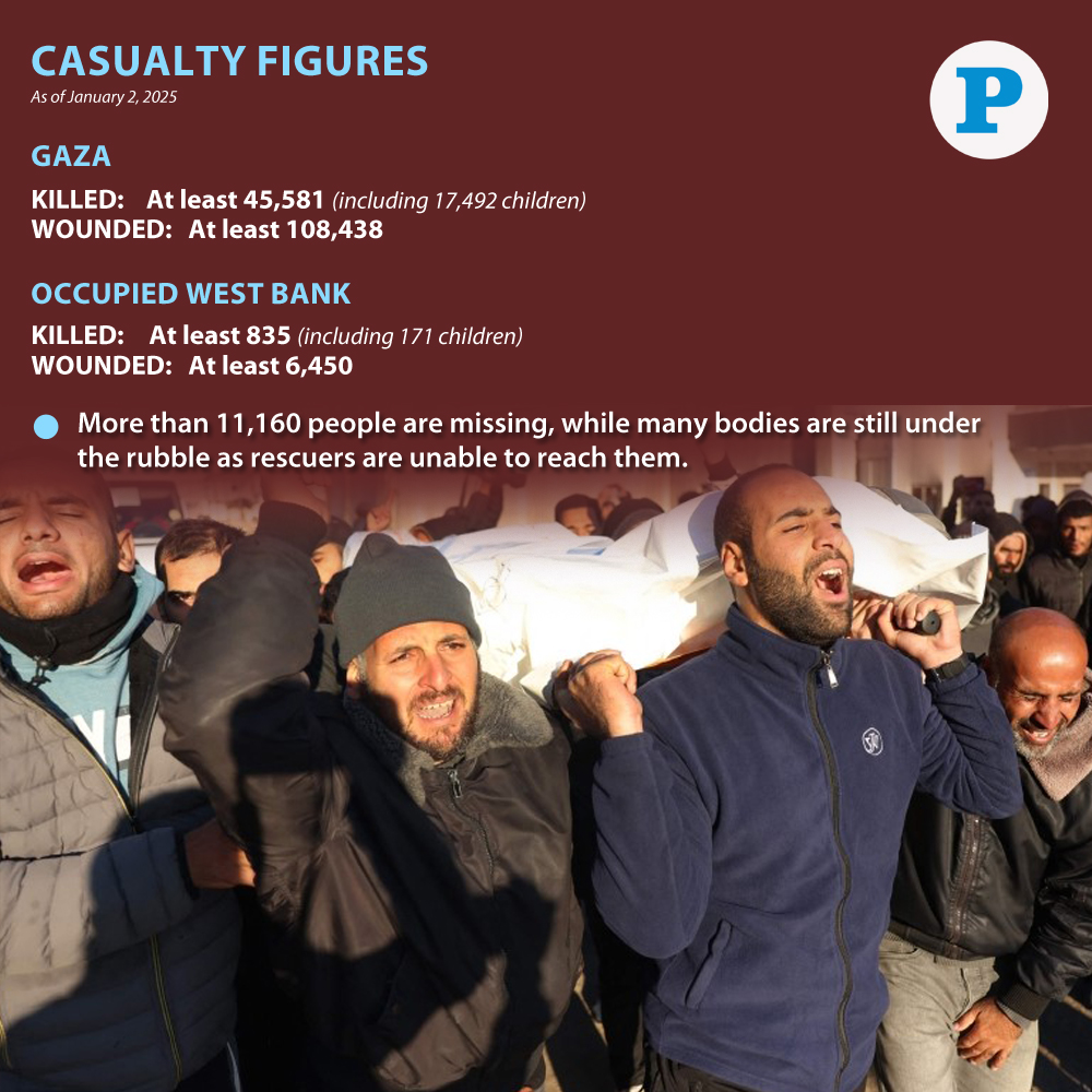 Doha, Qatar: Palestinian health ministry said today, January 2, that at least 45,581 people have been killed by Israeli occupation forces in nearly 15 months of war on Gaza.