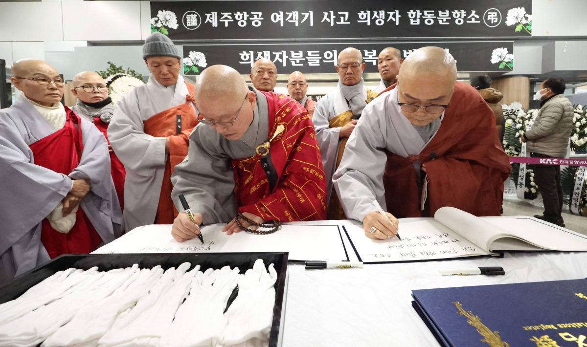 Buddhist monks write in the guest book after paying their respects to the victims of the Jeju Air Boeing 737-800 aircraft which crashed and burst into flames at Muan International Airport in Muan, some 288 kilometres southwest of Seoul on January 2, 2025. Photo by YONHAP / AFP