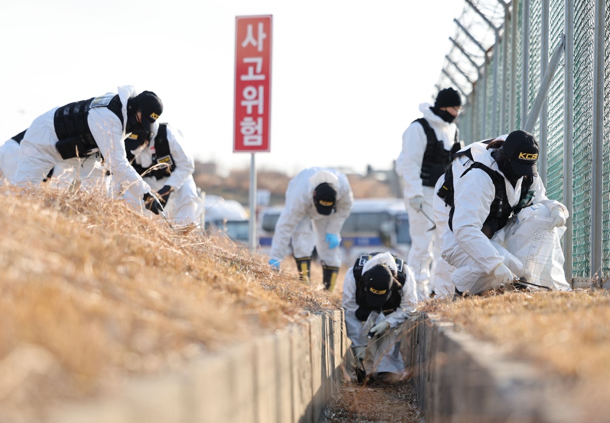 Members of a police scientific investigation team conduct a search operation near the site where a Jeju Air Boeing 737-800 aircraft crashed and burst into flames at Muan International Airport in Muan, some 288 kilometres southwest of Seoul on January 1, 2025. Photo by YONHAP / AFP