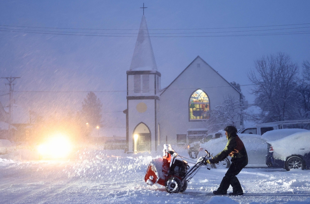 Michael Murray uses a snowblower as snow falls north of Lake Tahoe in the Sierra Nevada mountains during a powerful winter storm on March 01, 2024 in Truckee, California. Mario Tama/Getty Images/AFP