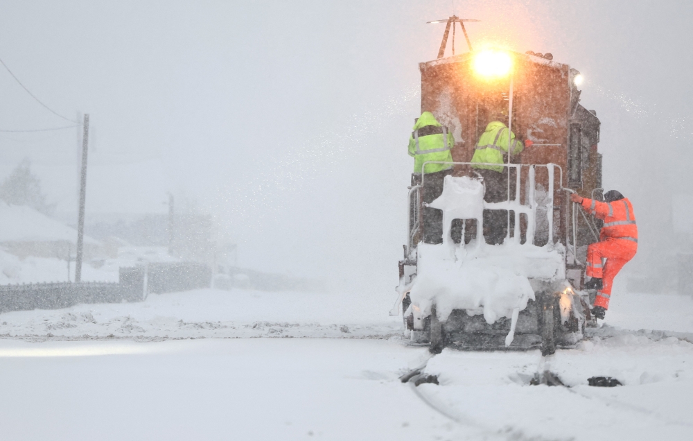 A train worker climbs aboard as snow falls north of Lake Tahoe in the Sierra Nevada mountains during a powerful winter storm on March 01, 2024 in Truckee, California. Mario Tama/Getty Images/AFP