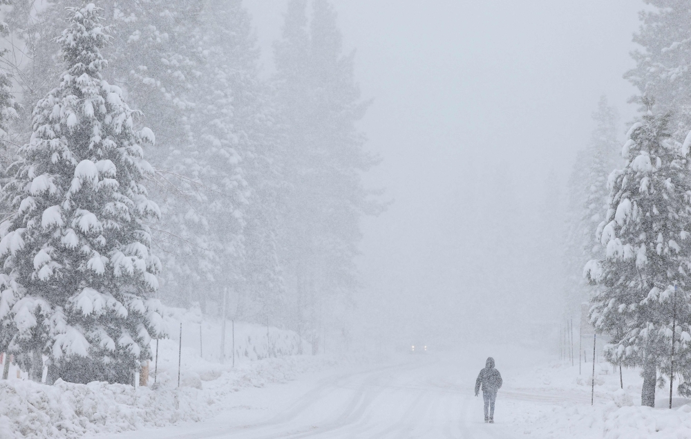 A person walks as snow falls north of Lake Tahoe in the Sierra Nevada mountains during a powerful winter storm on March 01, 2024 near Truckee, California. Mario Tama/Getty Images/AFP