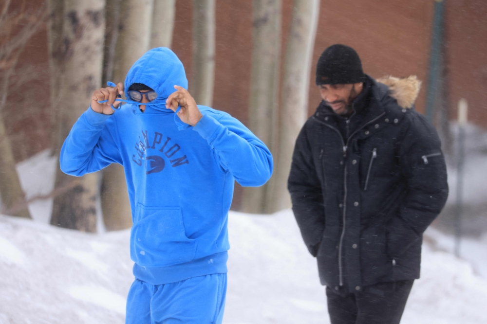 A person covers their face while walking in the snow in Mammoth Lakes, California, on March 1, 2024. (Photo by David Swanson / AFP)