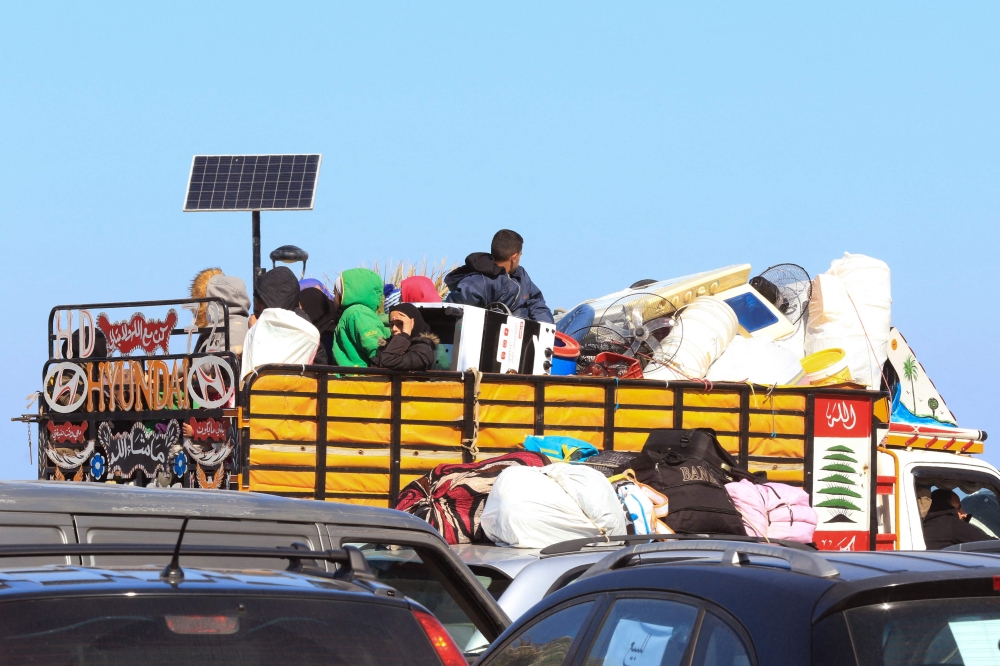 A family rides in the back of a lorry as motorists flee villages in southern Lebanon along the coastal road through the city of Sidon on March 2, 2026. (Photo by Mahmoud Zayyat / AFP)