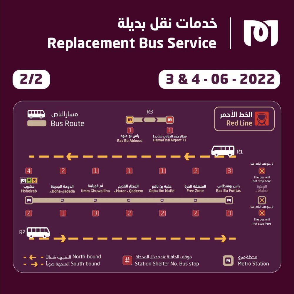 Replacement buses will operate every five minutes between Ras Bu Fontas and Lusail QNB stopping at all stations except Al Wakra and Katara.