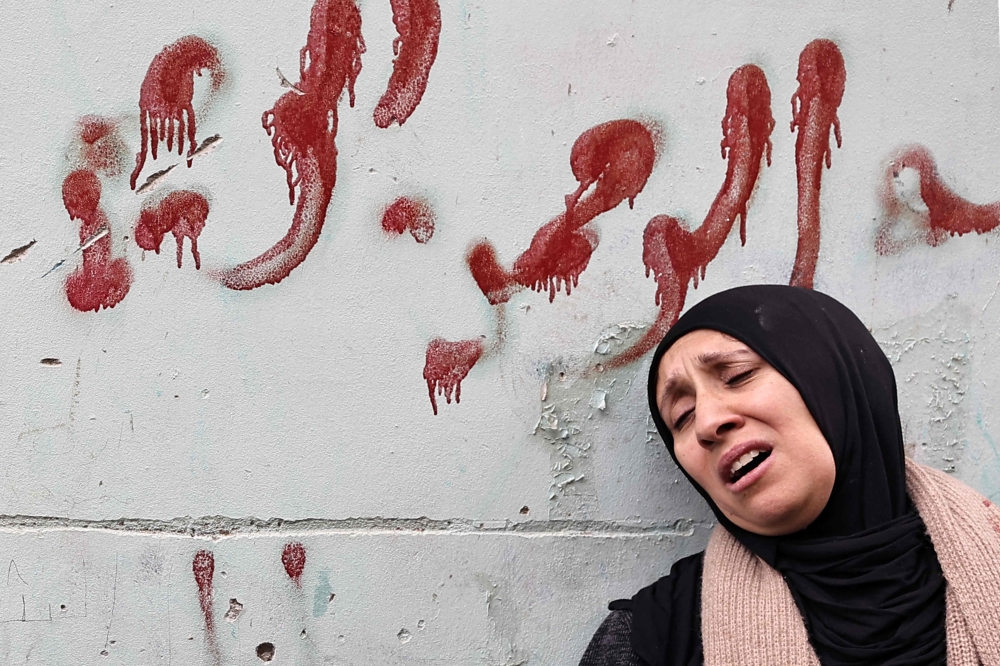 The mother of Muhammad Ayman Ghazawi and Basel Ayman Ghazawi, two of three Palestinian men killed by undercover Israeli agents mourns during their funeral in the occupied West Bank city on January 30, 2024. (Photo by Zain Jaafar / AFP)