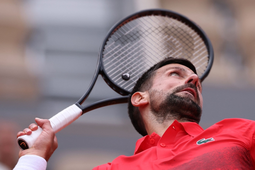 Serbia's Novak Djokovic serves to Britain's Cameron Norrie during their men's singles match on day 9 of the French Open tennis tournament on Court Philippe-Chatrier at the Roland-Garros Complex in Paris on June 2, 2025. (Photo by Alain Jocard / AFP)