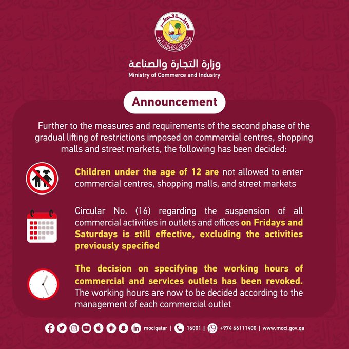 The ministry stated that these decisions were taken as part of the the measures and requirements of the second phase of the gradual lifting of restrictons imposed on commercial centres, shopping malls and streets markets.