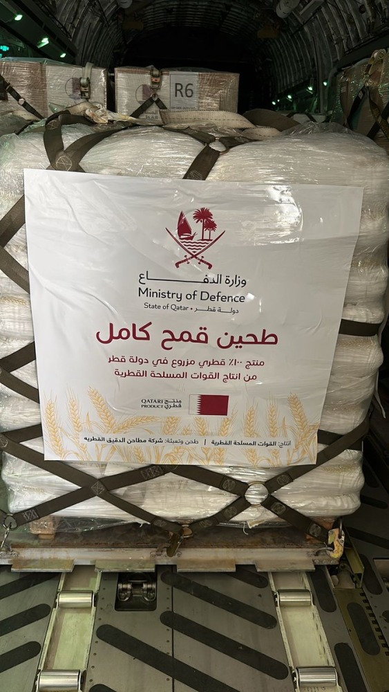 The food aid contains wheat produced by the Qatar Armed Forces, along with food baskets provided by the Qatar Fund for Development (QFFD).