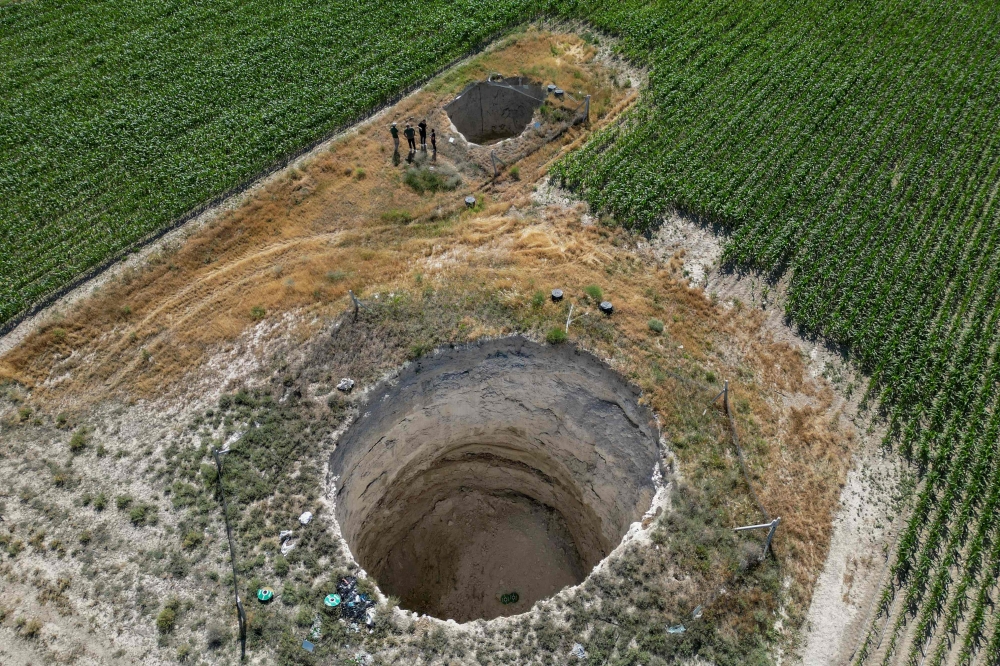 Arif Delikan, an associate professor of Konya Technical University inspects a large sinkhole in Karapinar in the central Anatolian province of Konya, on June 23, 2024. (Photo by Yasin Akgul / AFP)