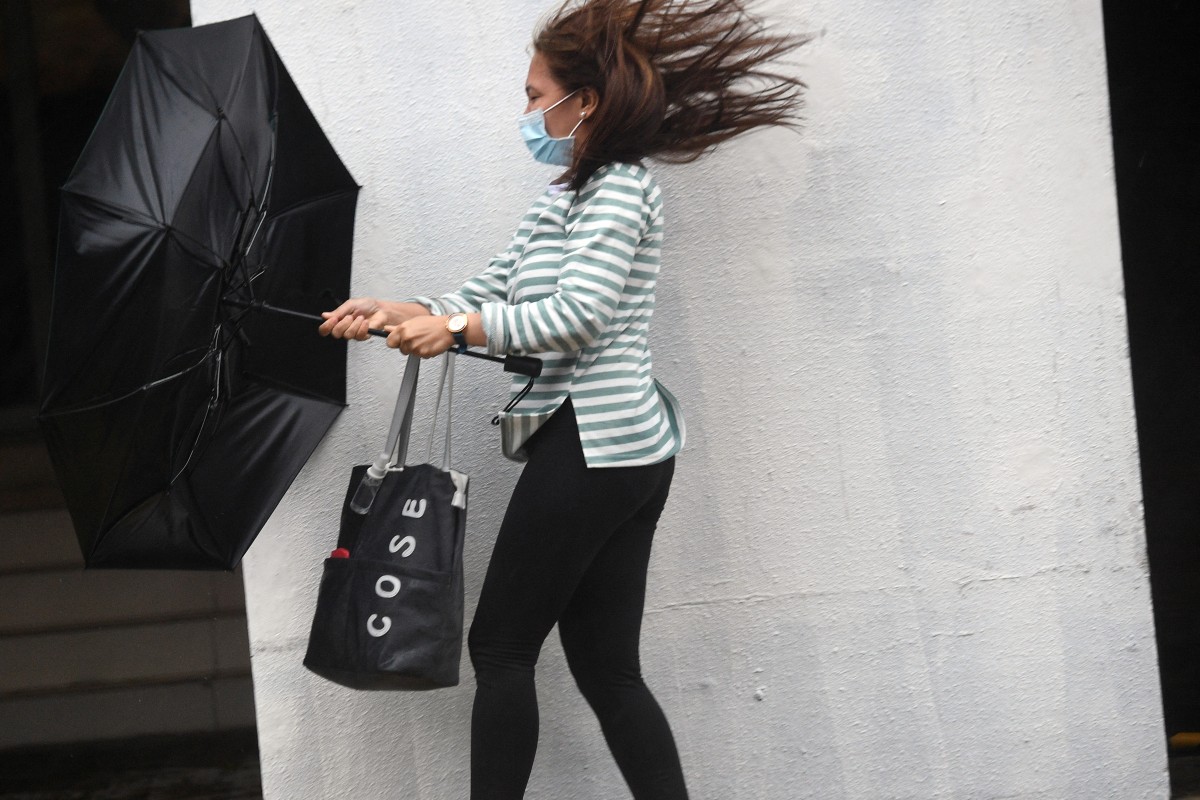 A pedestrian holds on to her umbrella amid heavy rains and wind brought by Tropical Storm Yagi in Manila on September 2, 2024. Photo by Ted ALJIBE / AFP
