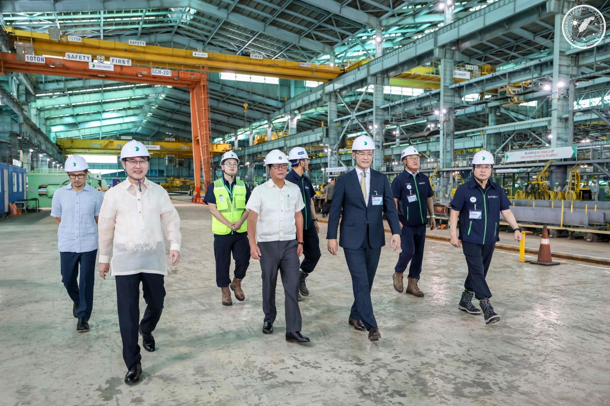 This handout photo taken and released by the Philippines' Presidential Communications Office (PCO) on September 2, 2025 shows Philippines' President Ferdinand Marcos Jr. (2nd L) inspecting the production during the inauguration of the Hyundai Shipyard in the province of Zambales. Photo by Handout / Presidential Communications Office (PCO) / AFP