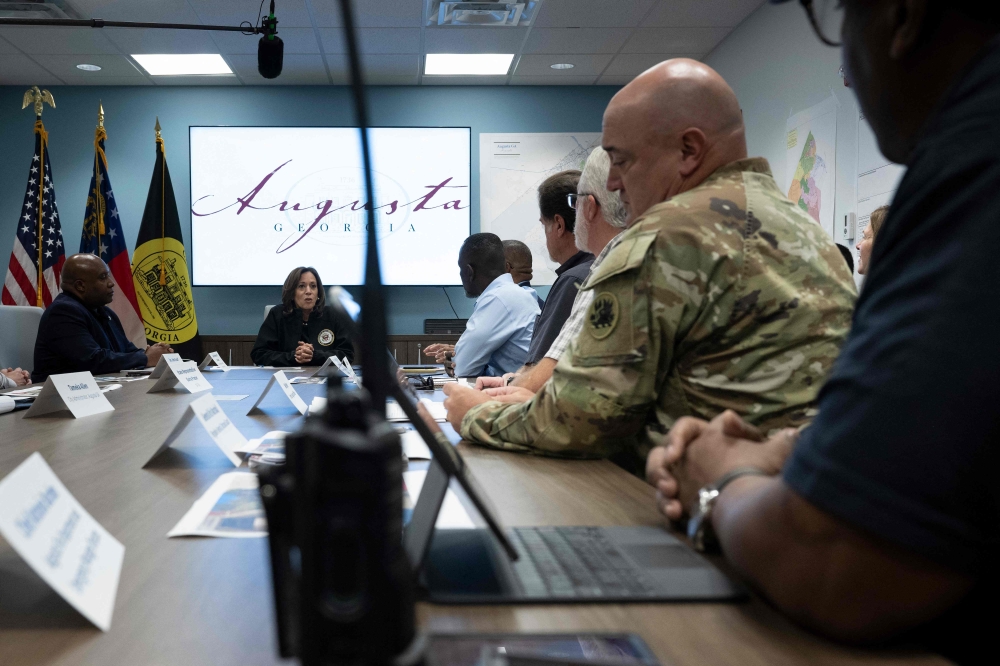 US Vice President Kamala Harris speaks before a briefing at an emergency operations center following the aftermath of Hurricane Helene, in Augusta, Georgia, on October 2, 2024. (Photo by Brendan Smialowski / AFP)
