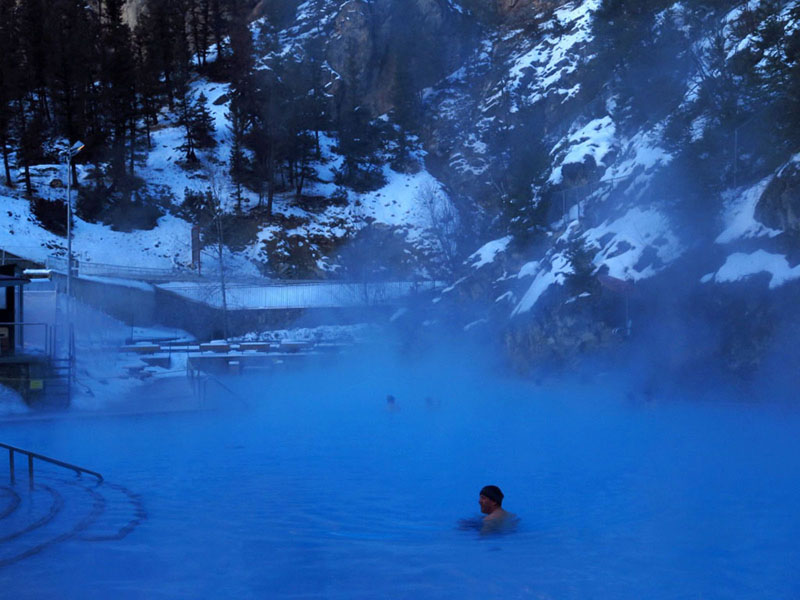 A complex of pools - fed by geothermal springs - visitor center and day spa located in Kootenay National Park. You'll find a 25-meter lap pool, large soaking pool and hot tub, which is often filled with cool water in summer. Admission about $5.50; day passes, which include a locker, from $8.
