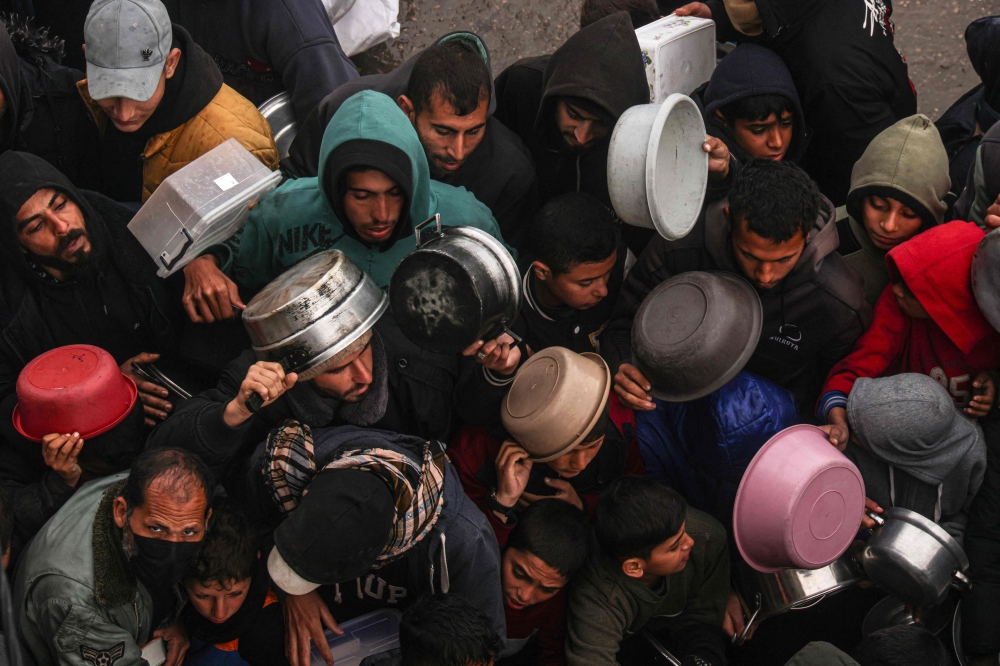 Palestinians receive food rations at a donation point at a camp for internally displaced people in Rafah in the southern Gaza Strip on February 2, 2024. (Photo by Said Khatib / AFP)