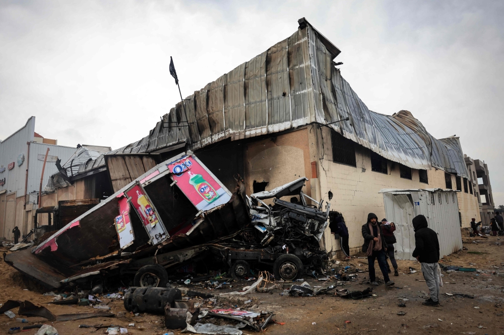 Palestinians walk past a fire-damaged UNRWA in Khan Yunis in the southern Gaza Strip on February 2, 2024. (Photo by Mahmud Hams / AFP)