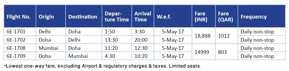 The Mumbai- Doha flight (6E-1708) will depart Mumbai at 11.20 and will arrive here at 12.30 and one-way fare will start from QR 803 (Rs 14,999) excluding airport charges and taxes.