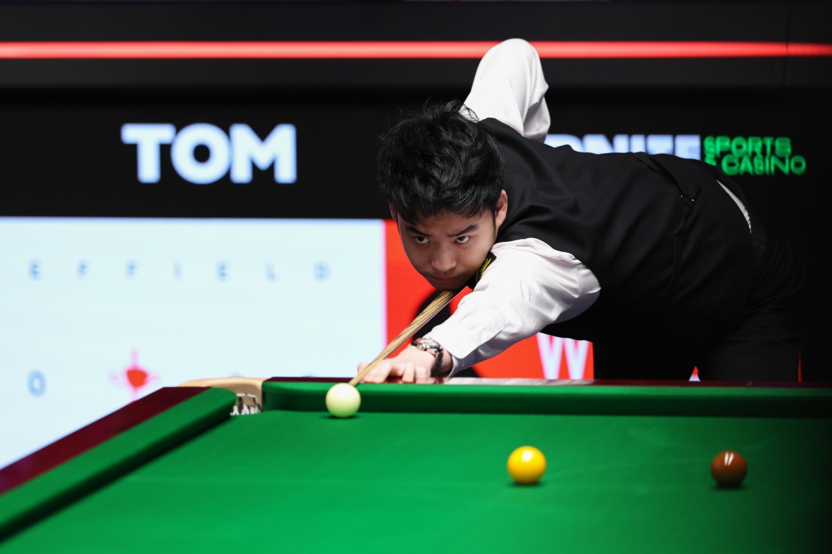 Si Jiahui plays a shot during the quarter-final match between Ronnie O'Sullivan of England and Si Jiahui of China at World Snooker Championship 2025 in Sheffield, Britain, April 30, 2025. (Photo by Zhai Zheng/Xinhua)