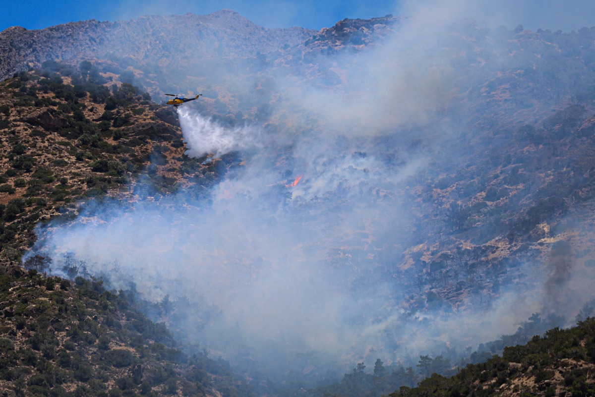 A helicopter drops water on a wildfire that broke out in Ierapetra at the southern Greek island of Crete, on July 3, 2025. Photo by Costas METAXAKIS / AFP