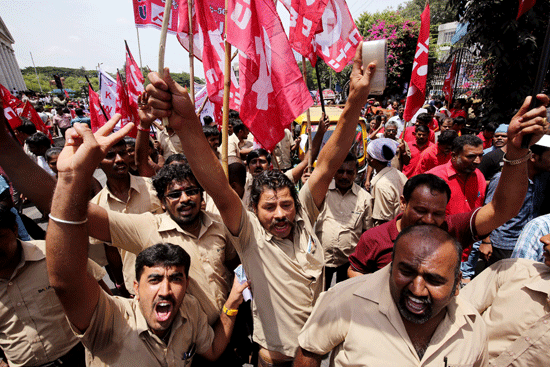 Members from different trade unions hold flags and chant slogans against the Bharatiya Janata Party-led government, during a protest rally in Bangalore.
