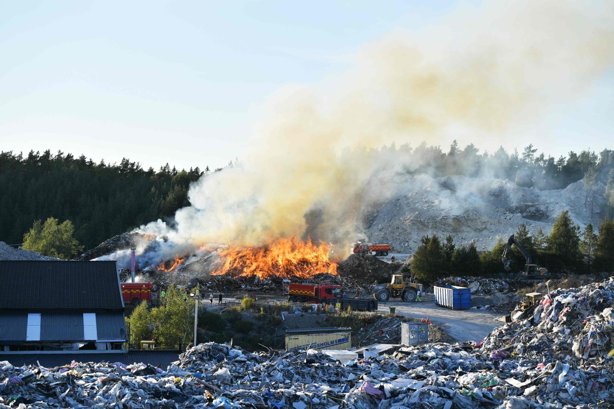A fire at a landfill is pictured on September 05, 2021 in Botkyrka, south of Stockholm, one of the several places in Sweden that the company "NMT Think Pink" has turned into a garbage dump. (Photo by Stina STJERNKVIST / TT News Agency / AFP) / Sweden OUT