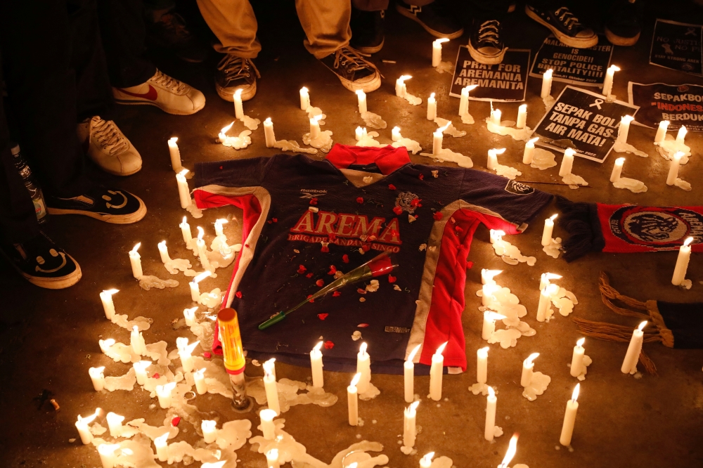 On Monday night, about a thousand soccer fans dressed in black shirts held a candlelight vigil at a soccer stadium in Jakarta’s satellite city of Bekasi to pray for the victims of the disaster.