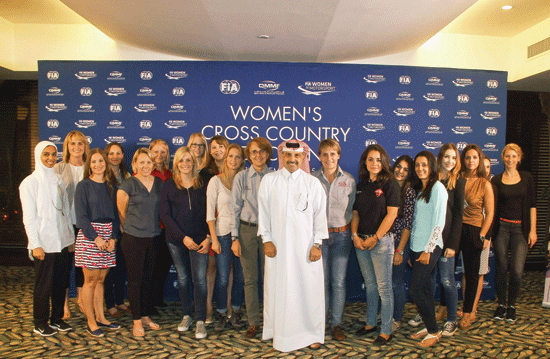 Qatar Motor and Motorcycle Federation (QMMF) President and FIA Vice-President for MENA Nasser bin Khalifa Al Attiyah poses for a picture with drivers and co-drivers attending the first FIA Women Cross Country Selection which kicked off yesterday in Doha with the registration for the 18 candidates that have been selected out of 85 applicants. The women are taking part in a five-day training programme in Qatar under instructors Jutta Kleinschmidt and Fabrizia Ponz, where the winners, one driver and one co-driver will be chosen to team up and participate in the 2016 Sealine Cross Country Rally. The drivers taking part ar Charlotte Berton of France, Jonna Lisa Eson Bradhe of Sweden, Emma Gilmour of New Zealand, Cristina Gutiérrez Herrero of Spain, Klaudia Podkalicka of Poland, Melanie Schulz of Germany, Yara Shalaby of Egypt, Molly Taylor of Australia and Sara Williams of United Kingdom. The co-drivers taking part are: Lisette Bakker of Netherlands, Tania Cardoso Sequeira of Portugal, Yasmeen Elmajed of Jordan, Veronica Engan of Norway, Rhianon Gelsomino of Australia, Sandra Labuscagne of South Africa, Jasmeen Singh Bhandhair of Zambia, Natalie Solbach-Schmidt of Germany and Lara Vanneste of Belgium.