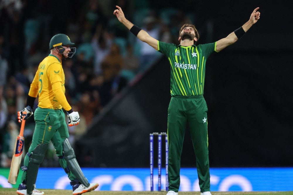 South Africa's Heinrich Klaasen (L) reacts after being dismissed by Pakistan's Shaheen Shah Afridi during the 2022 ICC Twenty20 World Cup cricket tournament match on November 3, 2022. Photo by David Gray / AFP