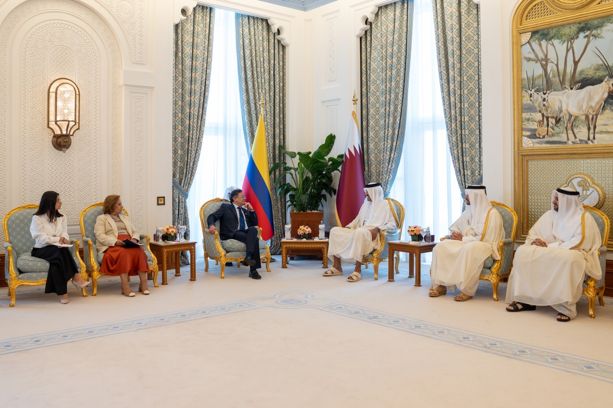 Doha, Qatar: The Amir HH Sheikh Tamim bin Hamad Al-Thani met at the Amiri Diwan on Monday morning with HE Gustavo Petro, President of the Republic of Colombia and his accompanying delegation, currently visiting the State of Qatar.