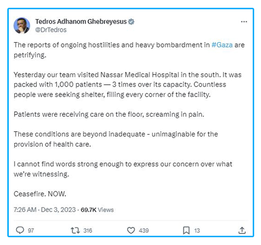 Conditions at the al-Nassar hospital in southern Gaza are “beyond inadequate”, the WHO chief said after a visit to the medical facility in the besieged enclave.