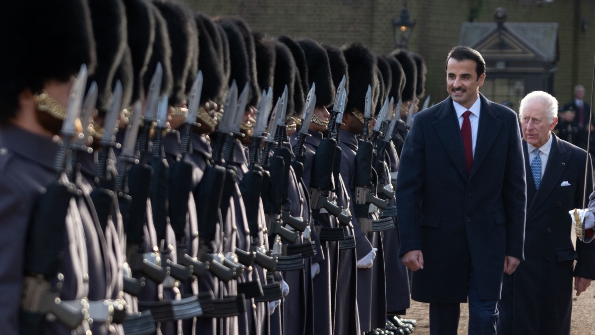 The reception ceremony began with the royal salute and the playing of the national anthem of the State of Qatar, after which HH the Amir, accompanied by HM King Charles III, inspected the Royal Guard of Honor.