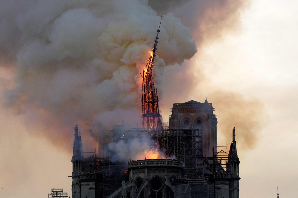 File: The steeple and spire of the landmark Notre-Dame Cathedral collapses as the cathedral is engulfed in flames in central Paris on April 15, 2019. (Photo by Geoffroy Van Der Hasselt / AFP)