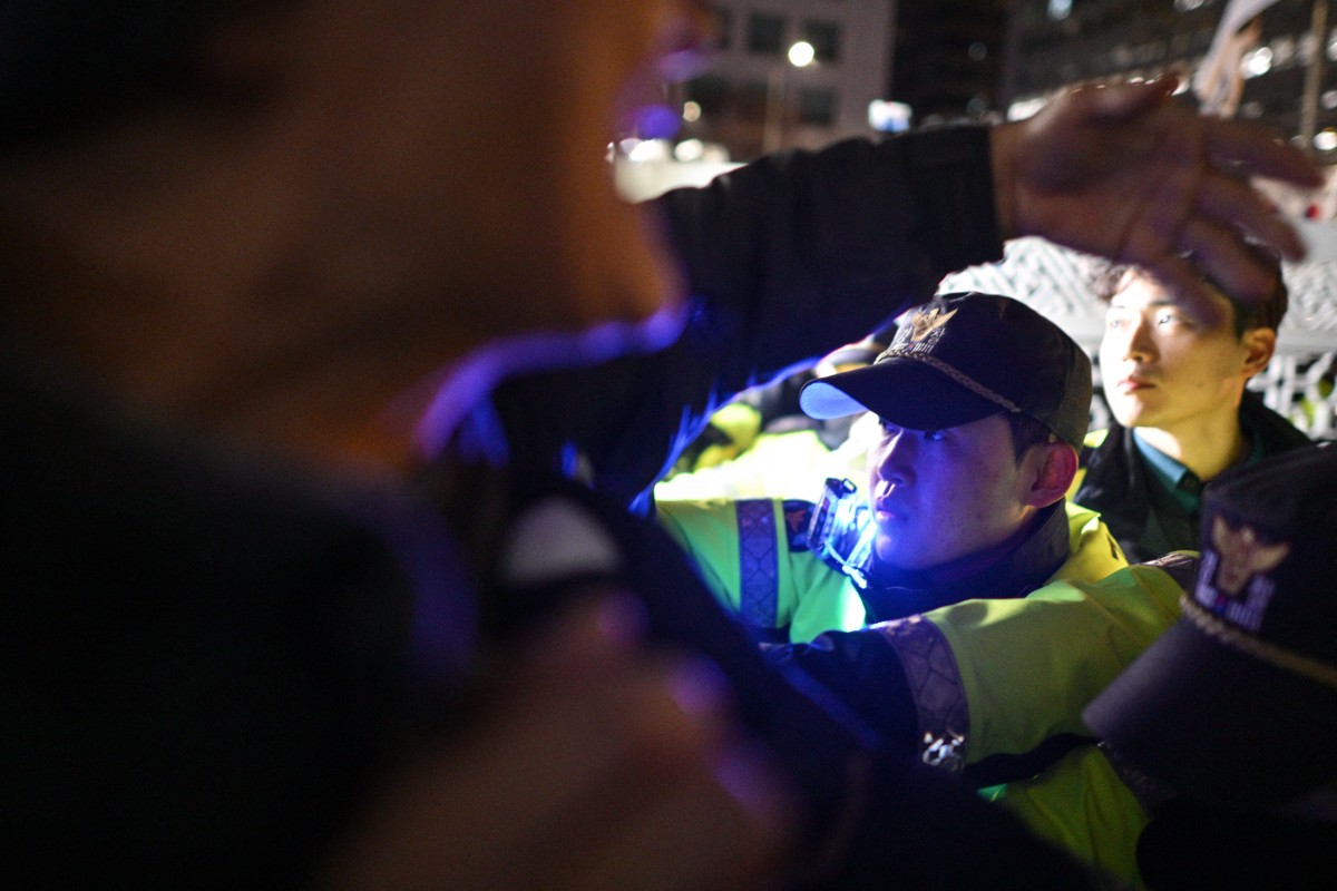 Police hold back people trying to enter the National Assembly in Seoul on December 4, 2024, after South Korea President Yoon Suk Yeol declared emergency martial law. Photo by Anthony WALLACE / AFP