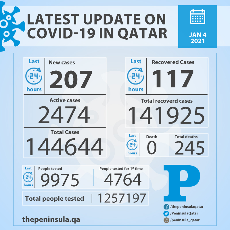 Doha: Ministry of Public Health (MoPH) today recorded 207 new cases of coronavirus (COVID-19) and 117 people recovered from the virus in the last 24 hours, bringing the total number of people recovered in Qatar to 141,925.