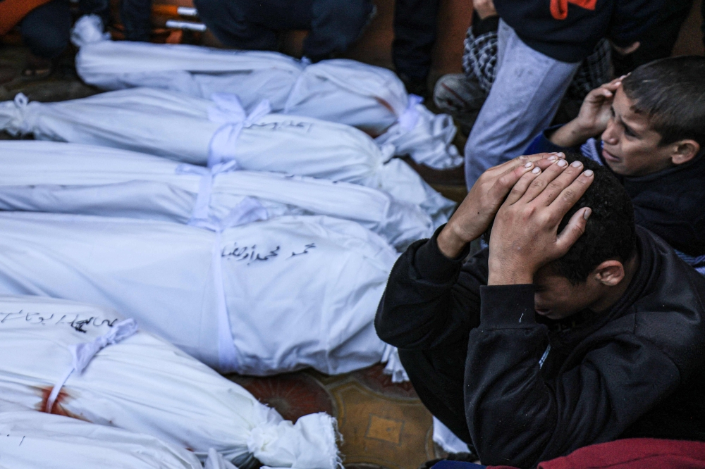 Relatives mourn over the bodies of the Salah and Abu Hatab families, killed when the tent where they were sheltering was hit by Israeli bombardment, at the morgue of the Nasser medical centre in Khan Yunis in the southern Gaza Strip, on January 4, 2024. Photos by AFP