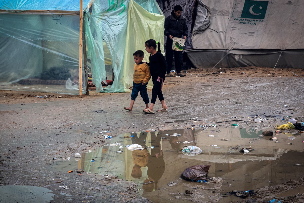 Palestinian children walk on a muddy path past tents at a makeshift camp housing displaced Palestinians, in Rafah in the southern Gaza Strip. Photo by AFP